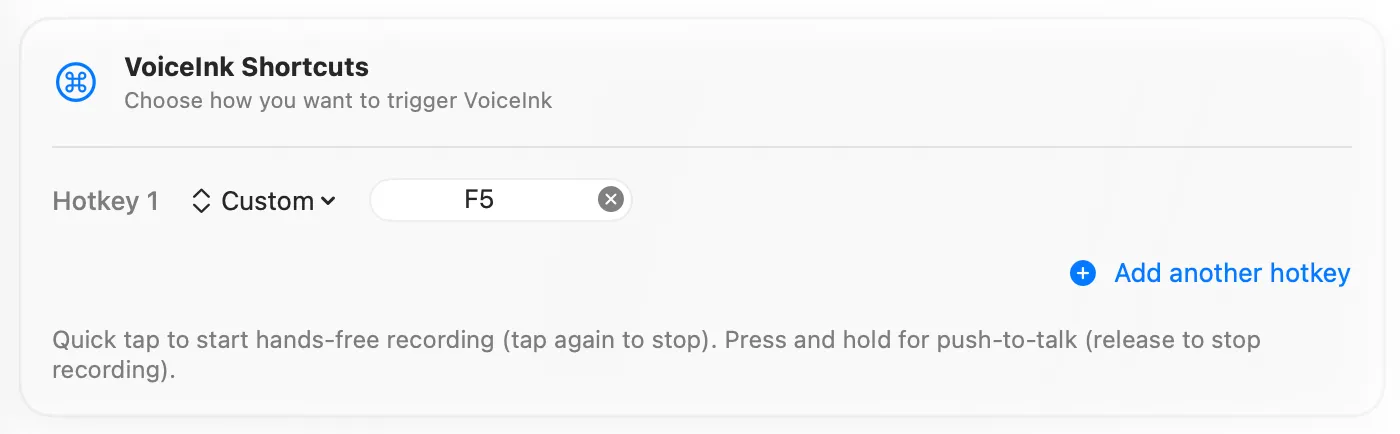 I originally figured I would remap to a single key that isn’t even on my keyboard, but I decided to use F5 instead because a) it’s an actual key I can press to easily set up the shortcuts in any app and b) it’s my little personal victory over the macOS dictation key I’ve always wanted to use.